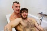 Peter Tater and Mirco Hot stumble into the steamy bathroom, ink dripping with water, cocks already rock-hard. Under the shower they drop to their knees, sucking each other sloppy, water pouring over tatted chests while they gag and slurp. Throats full, balls soaked. They move to the tub, legs spread wide, stroking each other’s thick dicks fast and nasty. Mirco twists his fist around Peter’s swollen head, spitting on it till Peter arches, grunts loud, and blasts thick ropes of cum all over his belly and the water. Hot jizz swirls away while they grin like filthy fuckbuddies.